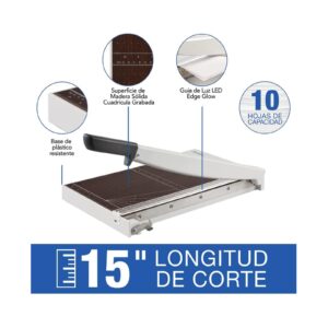 *EDGE GLOW, guía de luz LED que ilumina donde se hará el corte *Superficie de madera y base plástica *Cuadrícula y ángulos impresos para alinear tu documento *Navaja de corte auto-afilable y riel protector y gancho de seguridad *Tamaño de 15" (38cm)